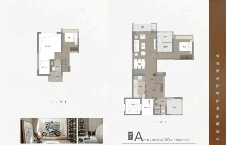 120㎡五房两厅两卫,主打“舒适改善”,总价略高于其他复式小户型。该户型上下两层独立分区,空间布局舒展,采光通风出色;客厅挑高设计,显得更加宽敞明亮,连接景观阳台,视野开阔;五个房间大小适中,布局合理,主卧自带独立卫生间和衣帽间,空间宽敞,舒适度高;厨房采用U型设计,操作空间充足,方便家人烹饪;得房率超过120%,空间利用率极高,能满足大家庭的居住需求。