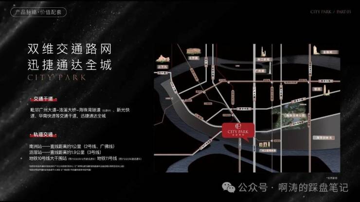 城市道路交通纵横交错,项目紧邻沥滘路、洛溪大桥、环城高速等城市主干道,向北可接驳广州大道、新光快速、内环路,向南可快速通达番禺、南沙等区域,自驾出行畅通无阻。依托完善的路网布局,30分钟内可直达大半个广州区域,20分钟可达珠江新城、琶洲电商总部、万博CBD等核心产业板块,无论是日常通勤、商务出行还是假日出游,都能实现畅达全城的出行体验,解锁都会全能出行生活,让繁华与静谧随心切换。