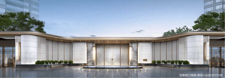 主入口构筑超50米门庭,以26米长、36片宣纸玻璃组成琉璃光窗,取意“六六大顺”,两侧配置20年以上造型朴树,营造归家仪式的厚重与吉祥寓意。