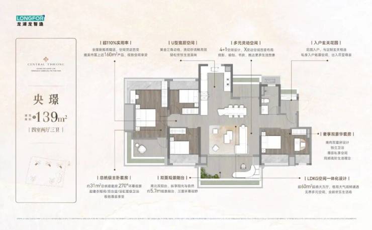 139㎡四房两厅三卫:双主卧套间设计,8.4米阳台可容纳6人聚餐,设备平台改造后收纳力提升3倍,总价490-550万元。