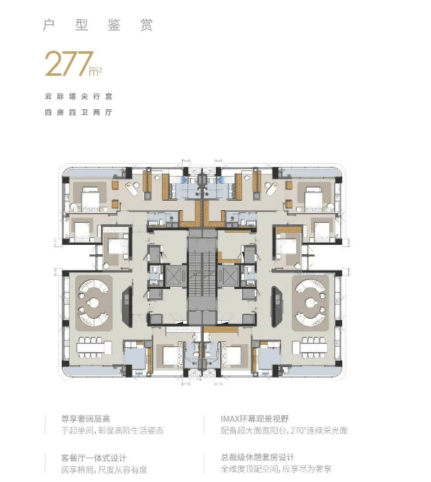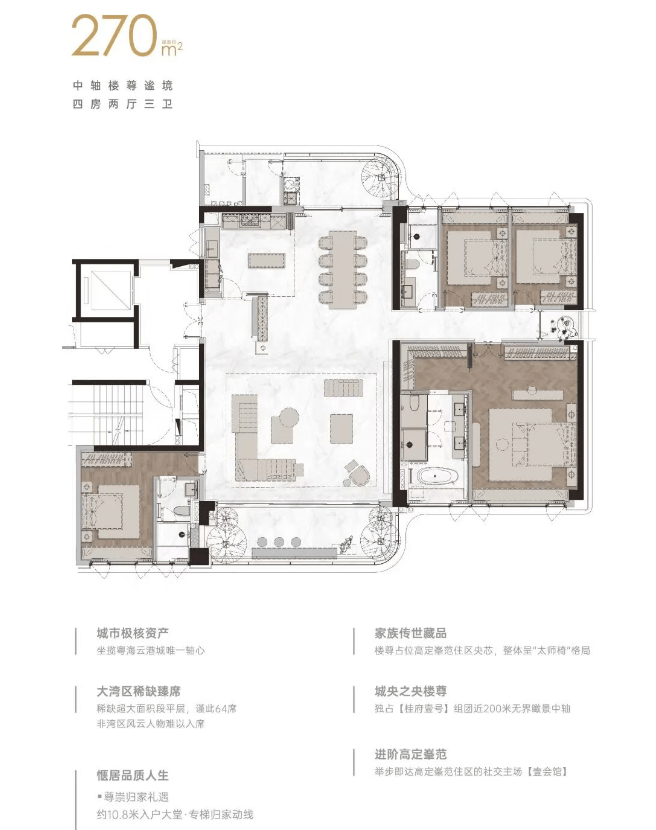 粤海·云港城住宅部分由9栋25层至35层的洋房大平层组成,以围合式布局设计,中央围合式园林宛若CBD中轴线上的城市绿洲。住宅组团粤海·桂府壹号,建面约140-264平方米现代美学大宅,提供地上地下双落客大堂,10.8米挑高星级酒店式中空大堂,专属私密电梯配置,独户阳光电梯尊享。大平层公寓同样以其卓越的品质和独特的魅力赢得了市场的广泛认可,采用大面积银灰色铝板加LOW-E玻璃幕墙,保证室内充足采光和景观视野最大化。