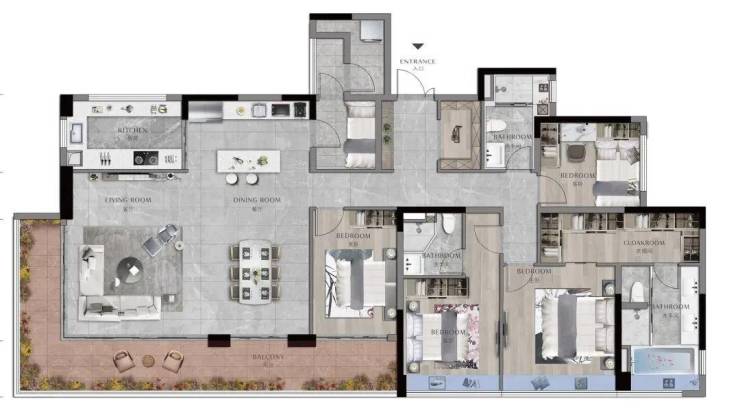 220㎡五房两厅三卫:顶奢改善大平层,五房全周期布局,适配大家族居住。约 9 米阔绰横厅,270° 环幕江景;主卧尊享独立衣帽间、卫浴、观景露台;五房设计 + 多功能空间,满足家庭全周期需求;空间尺度奢阔、精装标准顶级,是主城区稀缺的江景大平层产品。