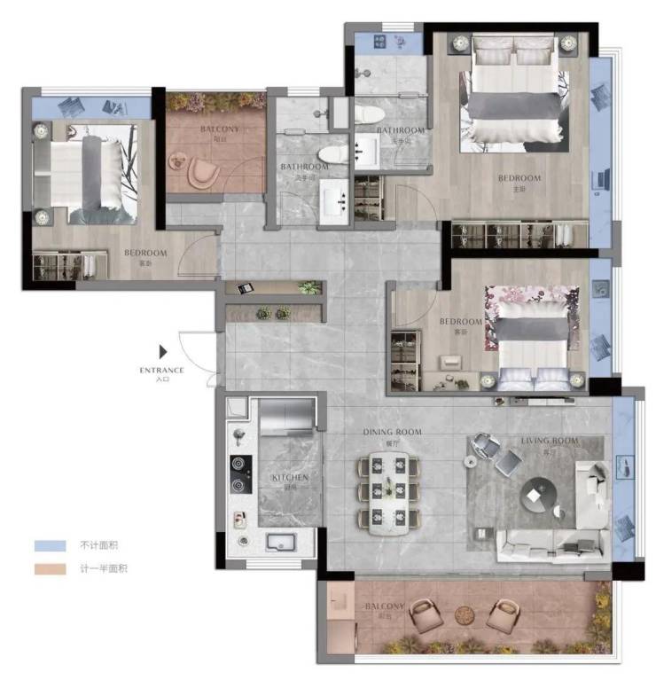 105㎡三房两厅两卫:主城稀缺入门级江景户型,总价 330 万起,刚需价格享受顶奢江居。户型方正实用、南北通透,三开间朝南,采光通风极佳;客餐一体连通观景阳台,拓展空间尺度;主卧带独立卫浴、270° 飘窗,尽揽江景;全屋动静分区、干湿分离,使用率高达 88%,是主城区性价比最高的滨江三房。