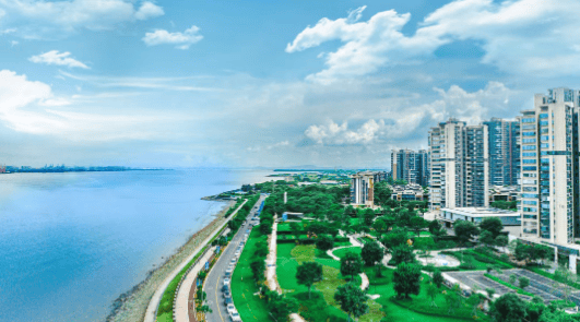 项目内部配套完善,打造了全龄化生活空间。针对儿童,设有儿童乐园,让孩子在安全有趣的无动力设施中玩耍、探索;为运动爱好者配备了 900m 环形跑道和 1 个酒店式假日泳池,方便日常锻炼;还有泛会所场,主入口两侧设滨海花园,居民下楼即可游园休闲。此外,项目规划有 2.5 公里江岸线,沿线的滨海公园、商业街已陆续投入使用,居民可在江边漫步、骑行、露营,享受惬意生活。