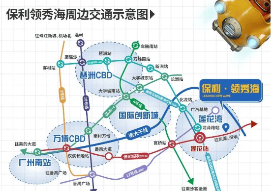 保利领秀海位于番禺东部莲花湾板块,地处琶洲以南的重要位置,南大干线全线开通后,极大提升了项目的交通便利性。从小区出发,自驾 26 分钟可直达琶洲,10 分钟到大学城,15 分钟至省妇幼,25 分钟抵达万博商圈,双向 6 - 8 车道、限速 80km/h 的南大干线,接驳新化快速,畅达广州主城区。此外,周边规划有 3 条过江隧道(沙渔洲隧道、化龙隧道、莲花山隧道),未来建成后最快 10 分钟可到黄埔。公共交通方面,目前虽依赖自驾,最近的地铁 4 号线需 10 公里,但后续有地铁 8 号线东延线(莲花湾至万胜围,7 站到万胜围,在建)和 17 号线(5 站到番禺广场,规划),还有佛莞城轨(3 站万博、4 站广州南)、穗莞深琶洲支线(3 站琶洲,在建),未来交通网络将更完善。