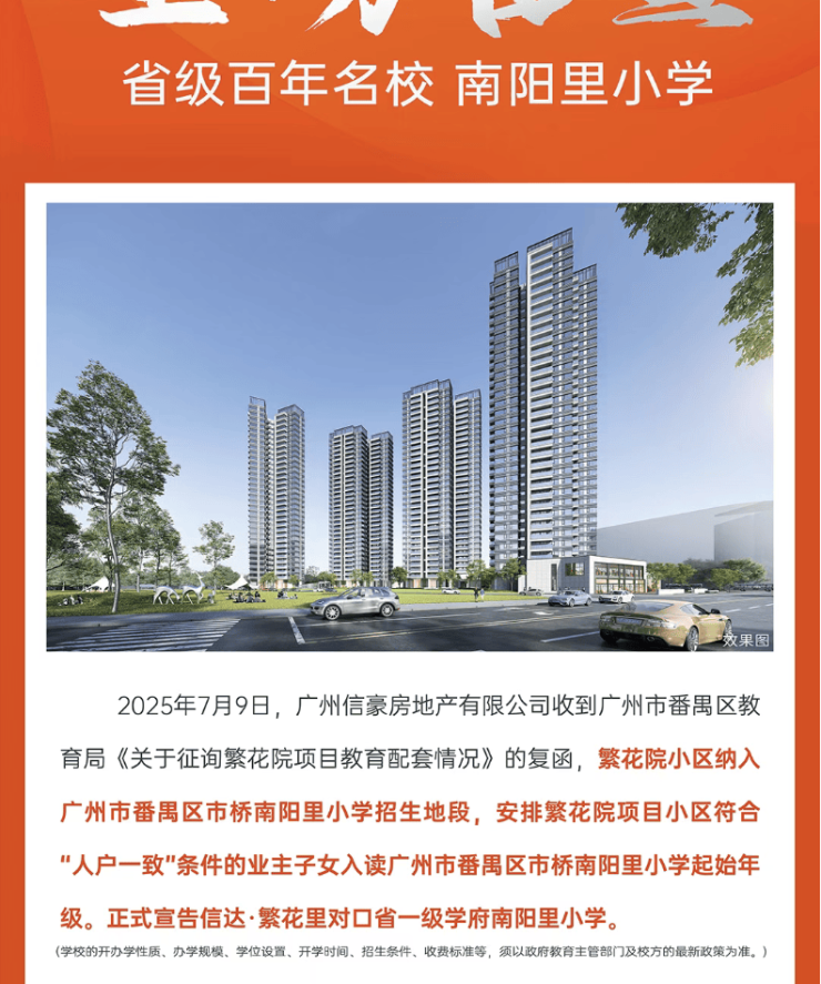 根据番禺区教育局2025年招生文件(穗番教〔2025〕12号),信达繁花里划入南阳里小学(省一级百年名校)招生范围,初中对口广东仲元中学、番禺实验中学,形成12年全龄优质教育链。项目距南阳里小学直线仅900米,步行10分钟可达。