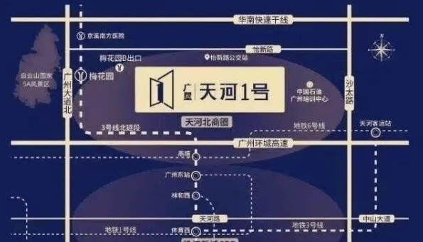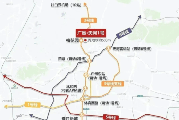广垦天河1号位于广州市天河区怡新路,真正意义上落子于天河CBD中轴之上。项目距离地铁3号线梅花园站B出口仅约400米,步行5分钟即可抵达。搭乘3号线,2站直达广州东站,5站即达珠江新城——这意味着从家门口出发,15分钟内便可通达广州最具活力的金融、商务与文化核心区。