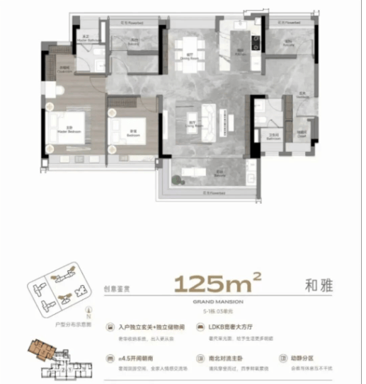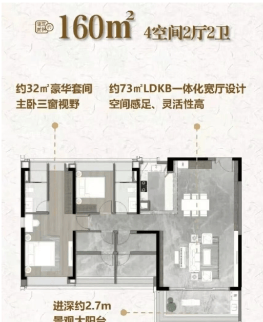 122㎡四房:四开间朝南,LDK一体化,双阳台(生活+景观),主卧带独立卫浴,动线流畅;
