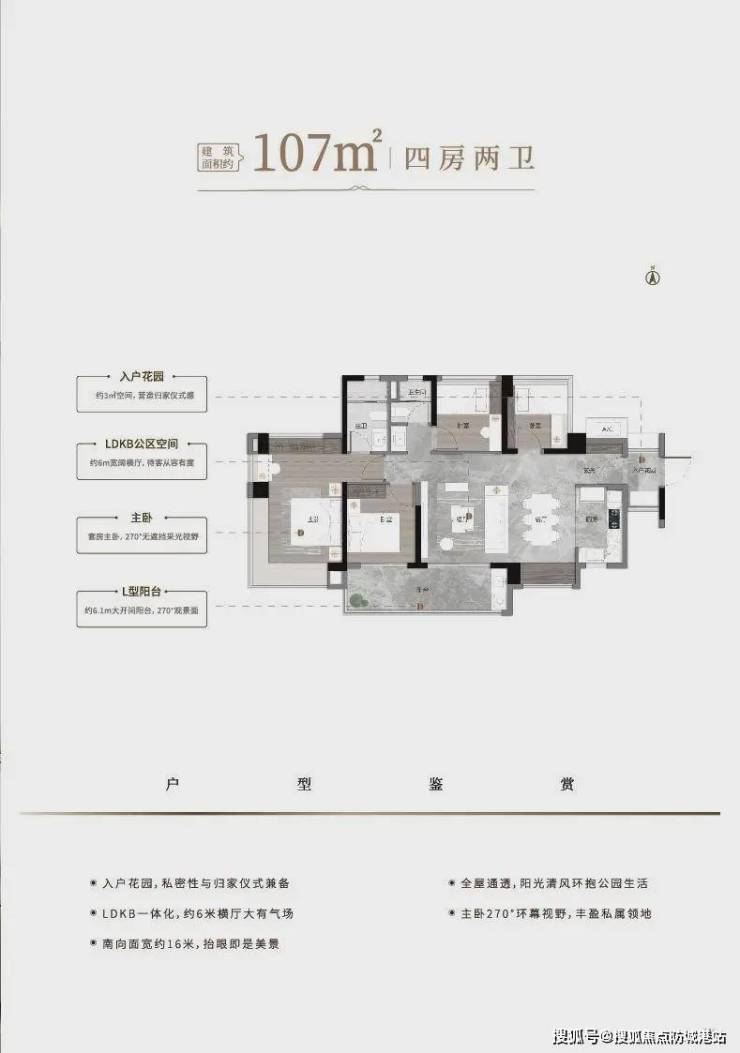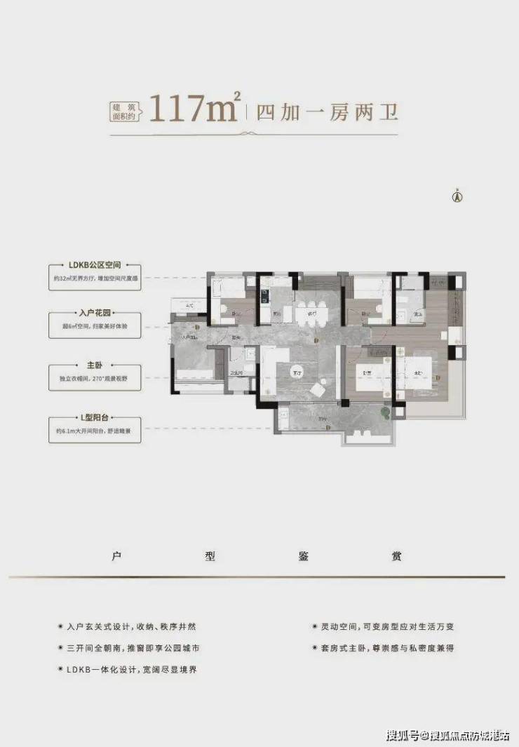 117㎡五房:独立衣帽间+双台盆主卫,南向面宽达16米,满足三代同堂需求。