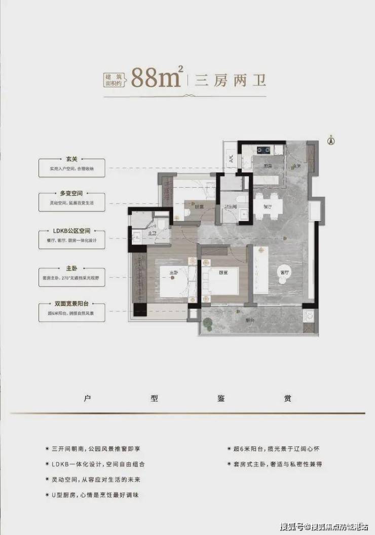 88㎡阔界三房:三开间朝南,6.8米双联阳台,U型厨房提升烹饪便利性。