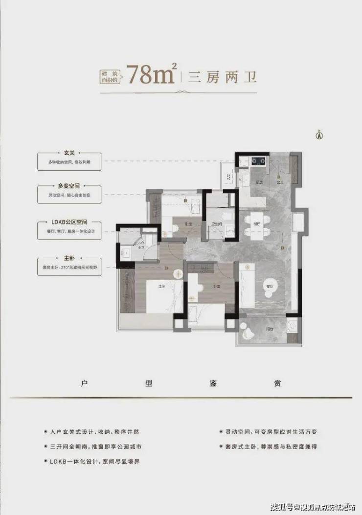 78㎡南向三房:双卫配置,主卧270°飘窗,实测使用率达102%。