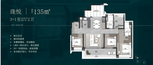 【珑悦】约135㎡三房两厅两卫:功能紧凑不失尺度,适合三口之家;