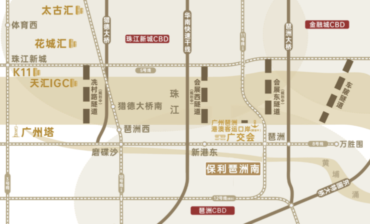 保利天奕位于海珠区琶洲南核心区域,是广州城市新中轴的关键节点,与珠江新城和国际金融城形成城市金三角。项目距离地铁8号线和11号线琶洲站仅约900米,步行即可抵达,实现轨道交通与城市核心区的无缝连接。周边主要干道包括新滘东路、科韵南路、环城高速及南沙港快速,形成高效的城市交通网络,居民出行无论自驾还是公共交通都十分便利。小区靠近大围公园,北侧对望广交会展馆,南接新滘路,东临科韵路,西靠赤沙旧改区域。合理布局的板楼形式和宽楼间距不仅保证通风采光,还在繁华中保留了静谧居住体验,使得住户能够在繁忙都市中享有私密、舒适的居家环境。