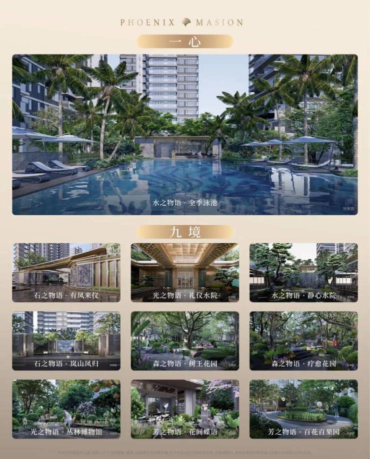 建筑设计方面,项目融合了岭南传统建筑元素与现代简约风格,打造出独具特色的建筑立面。花都首个约 52 米 U 字型高定酒店式门府,以 "凤凰展翼" 为设计灵感,约 7 米高超尺度归家大堂,双层飘板塑造出凤凰展翼的大气形态,彰显业主的尊贵身份。园林景观方面,项目匠心打造了花都首个 "一心九境" 岭南生活院落,以全季泳池为核心,串联起树王花园、疗愈花园、丛林博物馆、花间蝶语、百花百果园等九大景观节点,一步一景,步移景异,让业主在社区内就能感受到大自然的美好。项目还引入了绿城特色 IP"春知学堂",打造了花都首个社区园林科普系统,将园林景观与自然教育相结合,为孩子们提供一个亲近自然、学习知识的户外课堂。社区配套方面,项目拥有花都首个约 2000 平方米下沉式酒店会所 —— 凤凰艺境生活馆,设计了高尚社交、文化沉浸与休闲松弛三大功能空间,涵盖静心庭院、城市会客厅、行政酒廊、四库全书博览馆、健身房、瑜伽室、品茗馆等,并已实现前置运营,业主在购房后即可提前体验会所服务。此外,项目还配套有托儿所、约 2000 平方米文化馆、肉菜市场等生活设施,能够满足业主日常生活的各种需求。