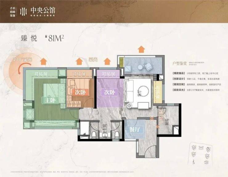 先看81㎡三房,这是典型的刚需神户型。户型做到了动静分区,休息区和活动区互不干扰,保证了居住的私密性。主卧带飘窗,不仅增加了采光和通风,还能作为休闲小空间,平时看看书、晒晒太阳,十分惬意。虽然面积不大,但功能齐全,客厅、餐厅、厨房布局合理,完全能满足小家庭的居住需求,对于预算有限的刚需族来说,是性价比很高的选择。