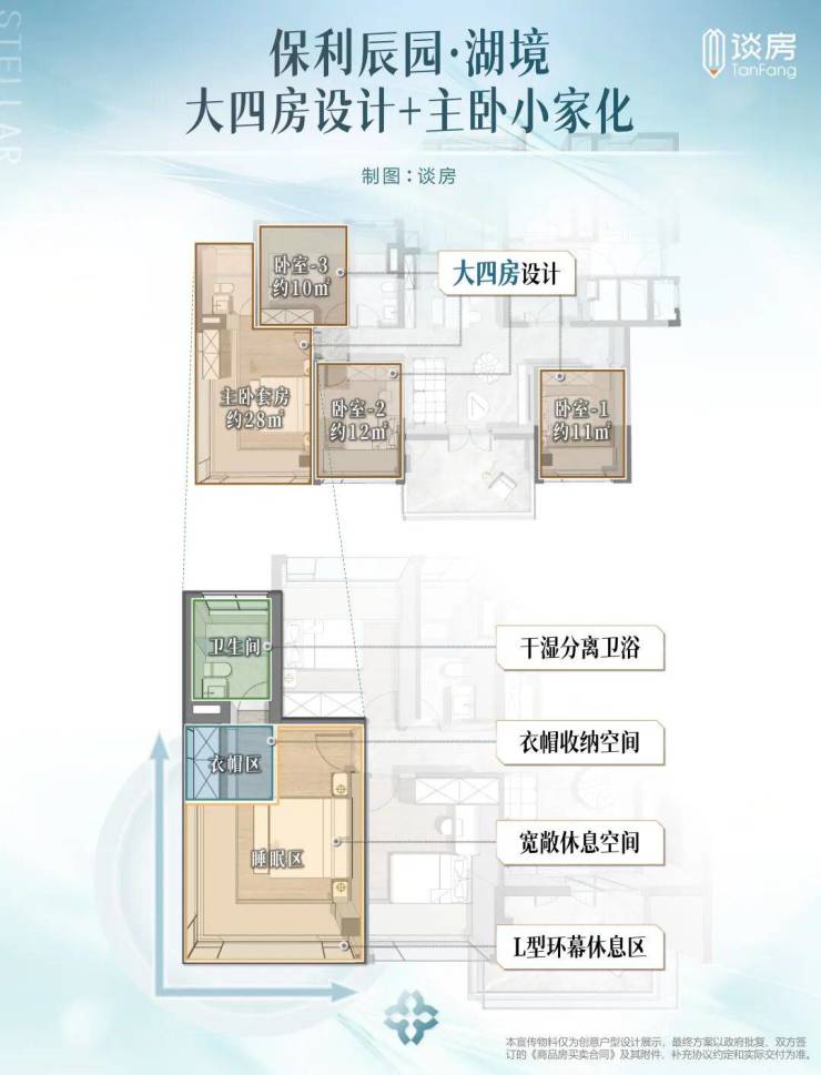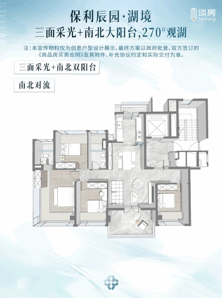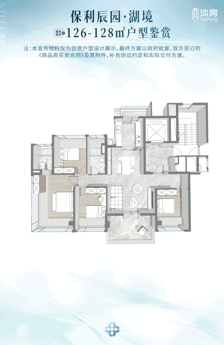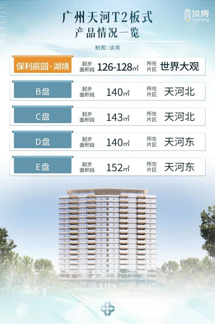 保利辰园湖境主打建面约98-143㎡三至四房,全部带装修交付,平均得房率超100%,部分板楼产品接近120%,领先市场平均水平。