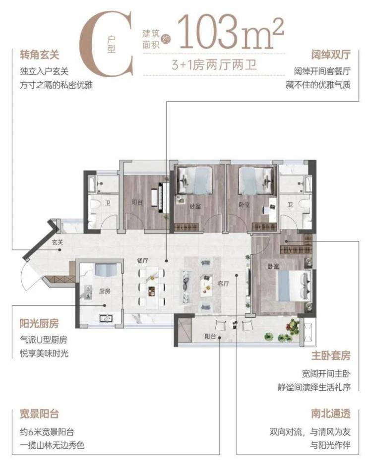 103㎡横厅四房则更适合三代同堂家庭,该户型采用横厅设计,客厅宽敞明亮,连接6米宽阳台,南北通透,通风和采光效果极佳;四个房间分布合理,主卧、次卧朝南,长辈房、儿童房布局合理,私密性强;而且,该户型的使用率超94%,根据项目官方实测数据,实际使用面积比同面积段其他户型多5-8㎡,相当于“买三房得四房”,性价比拉满。
