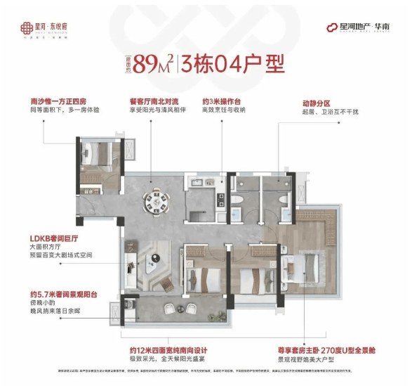 在限高、限容趋严的当下,星河·东悦府通过精细化设计,实现最高约128%的使用率。以89㎡户型为例,不仅做到四房格局,还实现南北对流、四开间朝南,这在广州乃至整个大湾区都极为罕见。