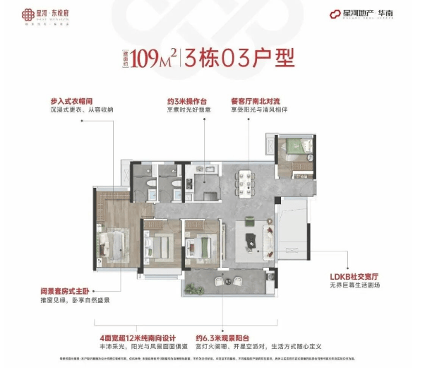 建面约106㎡四房:配备6.3米大阳台,四开间南向,采光极佳,LDK一体化设计提升空间感。