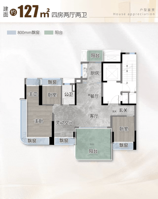 项目作为超新规标杆项目,户型以 “120% 超高使用率、全南向板楼、全景舱设计” 为核心亮点,涵盖 127-170㎡四房户型,全部面向高端改善家庭,空间尺度与舒适度在珠金琶片区位居前列。户型设计遵循 “低密、通透、奢阔” 原则,通过全景舱(减少实体墙、扩大玻璃采光面)、花池、飘窗等拓展空间,同时采用 2 梯 2 户专梯专户设计,提升私密性与尊贵感。