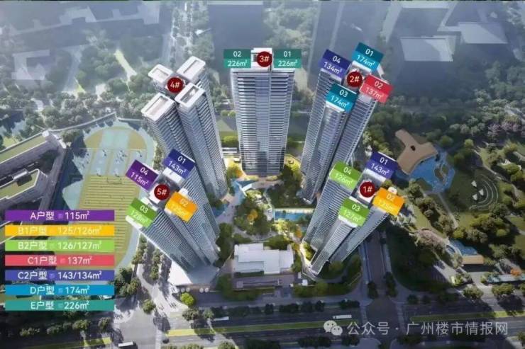 项目共有5栋,1-2-4-5是 3梯4户设计 面积有115-128-143-173,中间C位的3栋是两梯两户大平层,建面约226平,也是设计之都最大的户型。