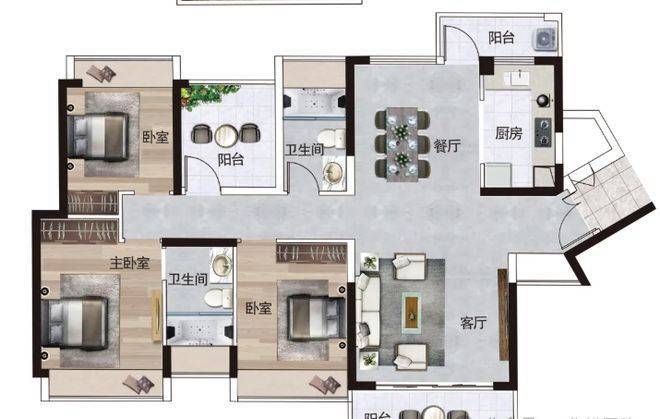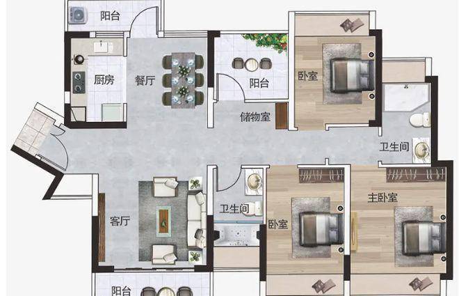 四房的布局合理,主卧套房设计,配备独立卫生间和衣帽间,为主人提供私密且舒适的居住环境。独立卫生间可安装淋浴和浴缸,满足不同的沐浴需求,衣帽间空间宽敞,方便主人收纳各类衣物和饰品。次卧和儿童房空间宽敞,可根据孩子的成长需求进行个性化布置,如设置儿童游乐区或学习区。书房可作为安静的工作或阅读空间,也可改造成客房,方便亲朋好友留宿。厨房采用 U 型设计,操作台面充足,橱柜收纳空间丰富,烹饪操作更加便捷高效。双阳台设计,除了客厅的景观阳台,生活阳台与厨房相连,方便日常晾晒衣物与放置杂物,让生活更加有序。这款户型适合对居住品质有较高要求,注重生活舒适性与便利性的家庭。