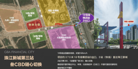 湾区金融城的一大亮点在于其卓越的交通便利性。项目距离地铁18号线横沥站仅约80米,步行即可轻松抵达。这条快速地铁线连接了广州的主要商务区如珠江新城、琶洲和万博等,大大缩短了通勤时间:
