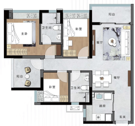 115㎡户型:3+1房设计,超30平方米宽广餐客通厅,南北采光通透。