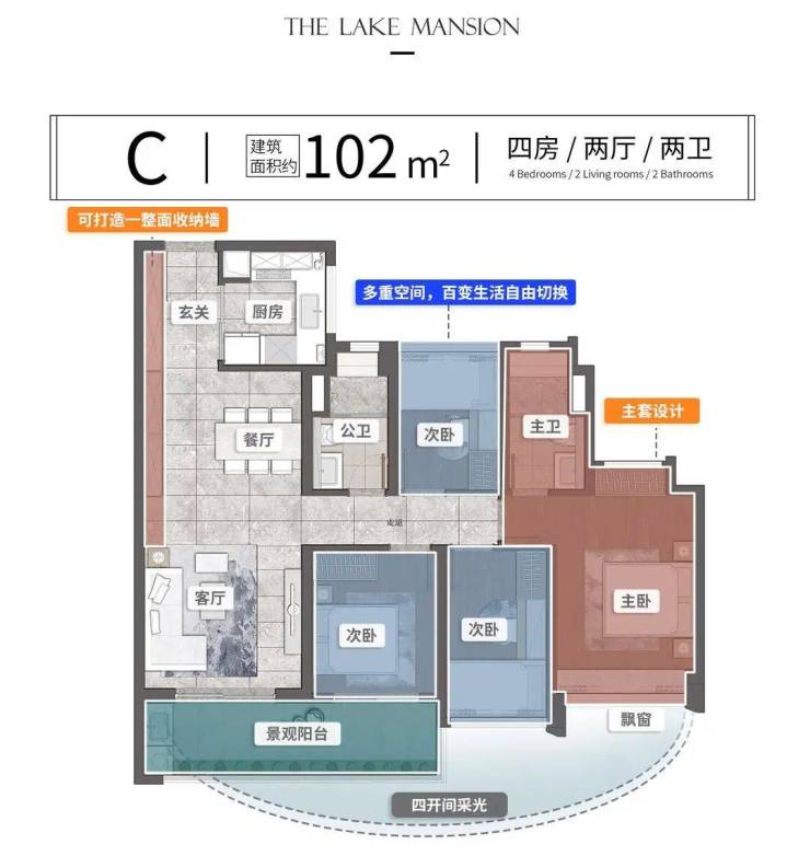 建面约102㎡的4房2厅2卫户型,展现出大气格局。四开间设计通透明朗,让阳光充分照进室内。约6米长的阳台,仿佛一幅IMAX画卷,为业主带来惬意的景致享受。雍容的主卧套间,配备完善的设施,彰显尊贵生活品质,业主可以尽情享受舒适的私人空间。这个户型不仅空间宽敞,而且布局合理,能够满足家庭成长过程中对空间的多样化需求,无论是二孩家庭还是三代同堂,都能在这里感受到温馨与舒适。售楼处电话:400-828-5661售楼处已认证购房咨询热线