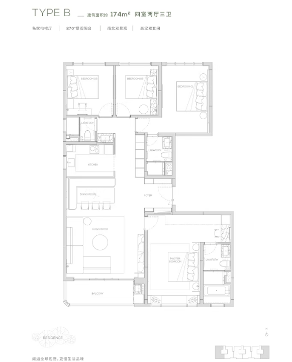 所有楼栋均为16-17层纯板式小高层设计,采用专梯专户布局,保证了居住的私密性和舒适度。推荐户型为168平方米四叶草户型,四室两厅三卫,配备M+科技系统,实现绿色健康的宜居标准。