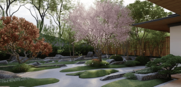 园林意境:小林政彦的“三庭四谷”四季诗篇。社区园林由亚洲景观设计巨匠小林政彦(代表作品:东京六本木山庄)匠心打造。他以“三庭四谷”为空间序列,营造出充满东方美学意境与仪式感的归家旅程。园林并非简单的绿化堆砌,而是精心规划了“春之谷、夏之谷、秋之谷、冬之谷”四大主题景观区,并搭配种植相应季节的代表性名贵树种(如黑松、香樟、樱花)。通过蜿蜒的步道、精致的水景、艺术的置石,营造出步移景异、四季皆景的沉浸式体验。入口的“樱花大道”更是奠定了社区浪漫、尊贵的归家礼序。