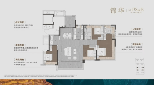 产品的极致打磨,是绿城锦海棠能够在禅城楼市中脱颖而出的核心杀手锏,其户型设计之精妙,堪称教科书级别的“空间魔术”。项目作为佛山超新规政策下的产品,户型设计充分享受新规红利,实现超100%的空间使用率,同时结合LDKB一体化、南北对流、大面宽朝南等设计,兼顾空间的利用率与居住舒适度。项目主推建面约111-171㎡的户型,覆盖刚需改善到高端改善的全需求,且全部为四空间设计。111㎡户型,2梯3户布局,约13.5米南向四开间,入户800库打造强大收纳空间,270°套房主卧带步入式衣帽间,在刚需面积段实现改善型居住体验;128㎡户型,私享电梯前厅,800库+入户玄关双重收纳,南北对流双阳台设计,LDKB一体化空间让客餐厨阳台无缝衔接;138㎡A户型,约5.4米LDKB一体化超级方厅,U型厨房提升烹饪效率,270°环幕视野主卧,南北双阳台对流;171㎡户型,约9㎡独立电梯厅私梯入户,约19.6米南向四开间,南北对流全明采光,双主套房设计满足多代同堂的居住需求。这种对物理空间的极致利用,不仅体现在得房率的数字上,更体现在居住的舒适度上——全明设计杜绝了暗卫暗房的压抑,科学布局让动静分区更加合理。无论是U型厨房的优雅操作,还是景观阳台的诗意休憩,每一处细节都经过了对生活场景的反复推敲,让每一位居者在每一平米的空间里,都能感受到设计的温度与生活的尊严,真正实现“小面积、大享受”的理想居住体验。