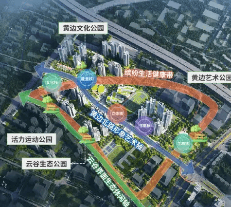 黄边艺术公园(在建):以莫奈画作为灵感,规划约4000㎡阳光草坪、300米中轴通廊、睡莲水景,未来将与活力运动公园、云谷生态公园串联,形成连续绿色慢行系统。