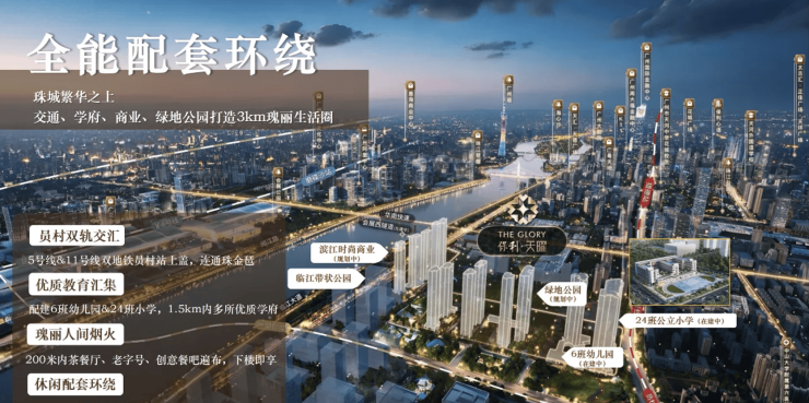 在自然环境方面,项目秉持“城芯藏境,亲江而居”的理念,周边生态资源丰富,步行可达临江带状公园、市政口袋公园(规划中),多个生态公园环绕,让业主在繁华城芯也能享受自然的馈赠。项目南面举步可达面朝珠江前航道的滨江绿带公园,浩瀚珠水承载千年商都荣耀,一江两岸的繁华天际线尽收眼底,业主可漫步滨江,感受江风拂面的惬意,享受亲江生活的诗意与浪漫。