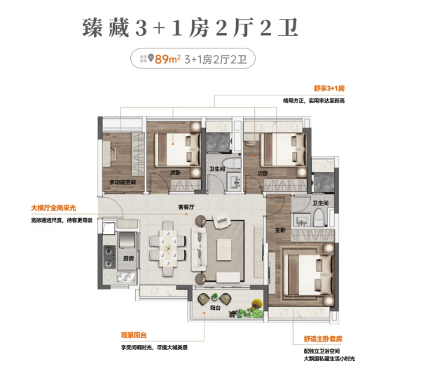 89㎡四房两厅两卫:南北对流,大横厅南向采光、通风、观景,相比周边同面积户型多出一间房且价格更低。
