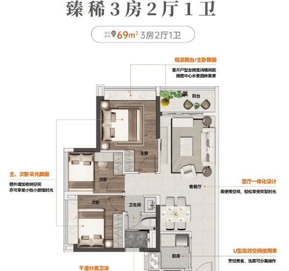 69㎡三房两厅一卫:紧凑实用,阔绰观景阳台,主次卧采光飘窗,干湿分离卫浴,U型厨房设计合理。