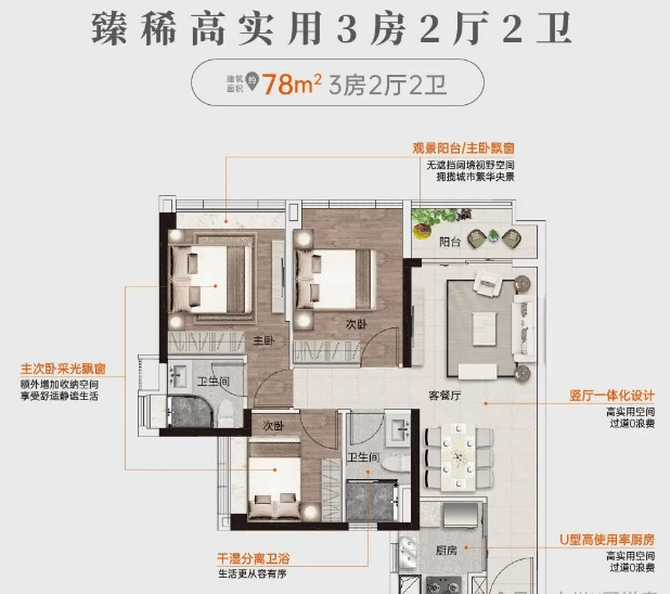 78㎡三房两厅两卫:无遮挡阔境视野空间,高实用空间,过道0浪费,额外增加收纳空间,享受舒适静谧生活。