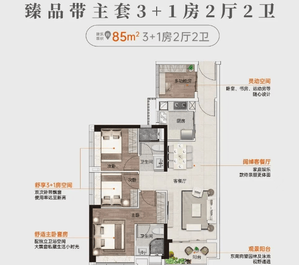 85㎡四房两厅两卫:东南向望园林及泳池,独立卫浴空间,大飘窗私藏生活小时光,使用率达新高。