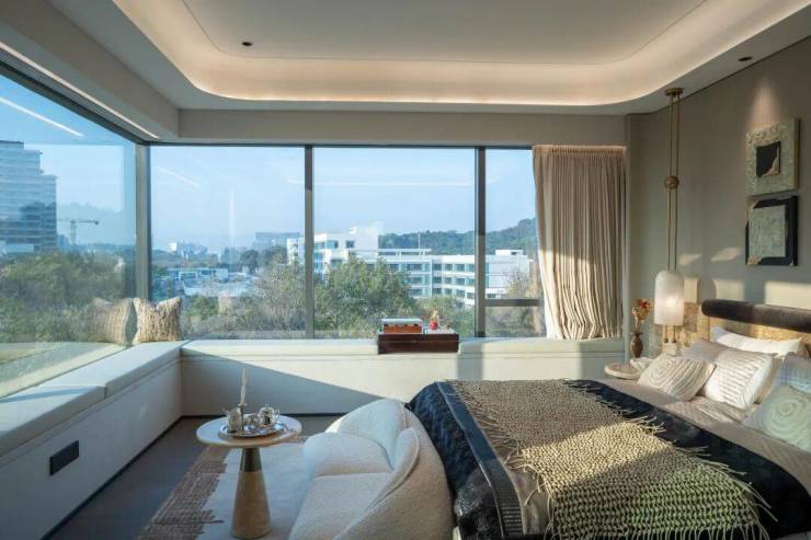 约37㎡酒店式主卧套房,配备约 11 米 L 型飘窗、步入式衣帽间等,演绎 "湖居即日常" 的奢侈。