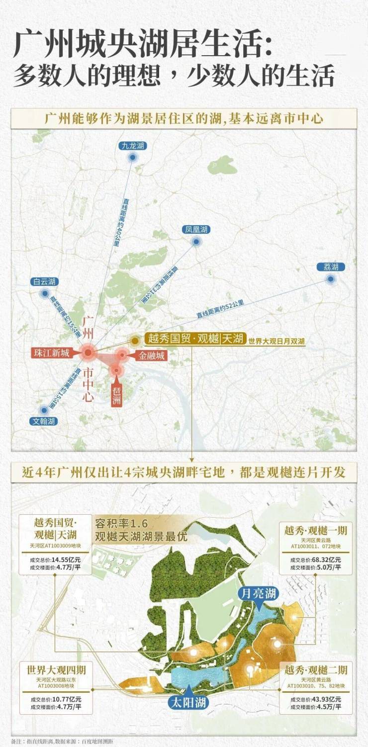 在市中心土地资源匮乏的情况下,广州能够作为湖景居住区的湖,基本远离市中心。近4年间,广州仅出让了4宗城央湖畔宅地,宗宗地价破4万+/㎡,最高直飙5万+/㎡。