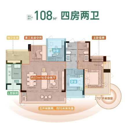 108㎡四房两卫:大户型设计,提供更舒适的居住体验,适合大家庭或追求高品质生活的住户。