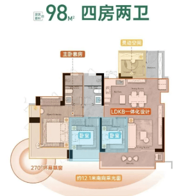 98㎡四房两卫:空间更为宽敞,能够容纳更多的家庭成员。