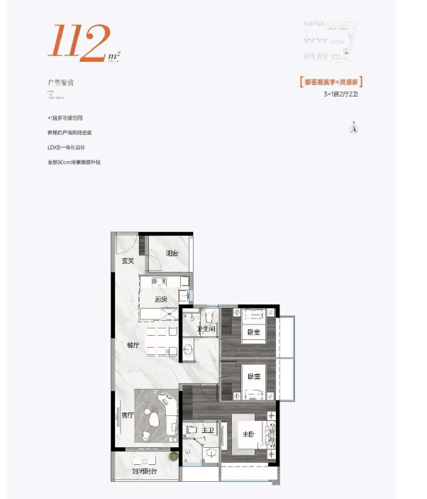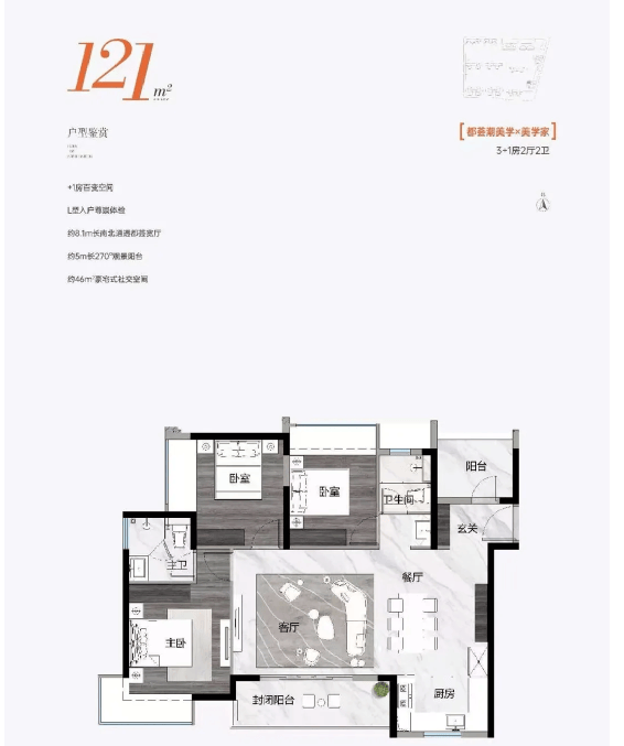 112-121㎡的3+1房户型,采用LDKB一体化设计,全屋80cm阔景飘窗升级,视野开阔,采光良好。121㎡户型还特别设计了南北通透的都荟宽厅和约5m长的270°观景阳台,提升了居住体验。
