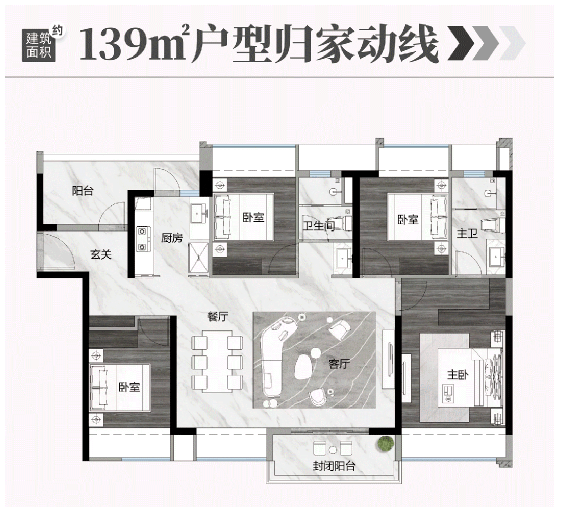 139㎡的4+1房户型则更适合家庭成员较多的家庭,约7m长的都荟宽厅和南向通透四开间的设计,使得室内光线充足,空间感强。预留横竖双厅+西厨创意改造的空间,增加了房屋的灵活性和实用性。
