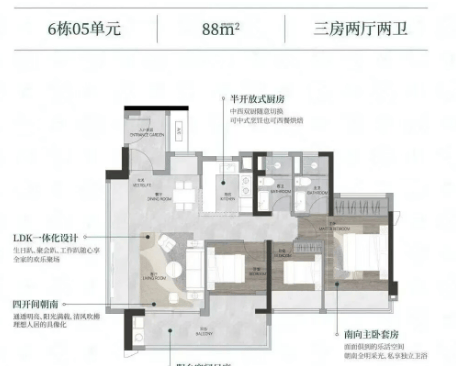 建鑫鹅谭名郡主打建面约82至141平方米的三至四房户型,所有户型均采用新规设计,注重采光和空间利用率,全南向布局,并配备了大尺寸阳台。其中,88平方米户型的阳台开间约为6.2米,105平方米户型的阳台开间约为6.5米,而125平方米户型的阳台开间则达到8.3米。每个户型都设有入户花园和超大飘窗,提升了居住舒适度。