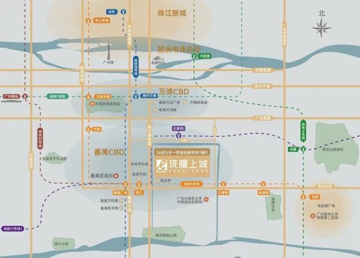珑曜上城不仅把大城生活卷到极致,更在番禺广场商圈之上,再造约68万㎡“超链聚场”。项目西侧金龙城财富广场有不少底商甚至引进了麦当劳。距项目2站的番禺广场,集合番禺的行政、交通、教育、医疗、文化中心,是与北万博平齐的番禺南中心。