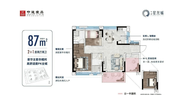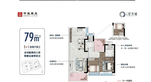 目前中建·星光城在售的最后一栋6号楼限时特惠,均价约为2.4万至2.5万元/平方米,具体价格视面积和楼层而定。在售户型包括约69平方米、79平方米、87平方米、91平方米和100平方米,分别对应三房两卫到四房两卫的不同户型需求。所有户型均采用全南向设计,采光通风良好,空间利用率高,部分户型赠送面积可达94%以上,充分满足刚需家庭的需求。特别值得一提的是,约100平方米的大四房户型,四开间朝南,适合多代同堂的家庭居住。