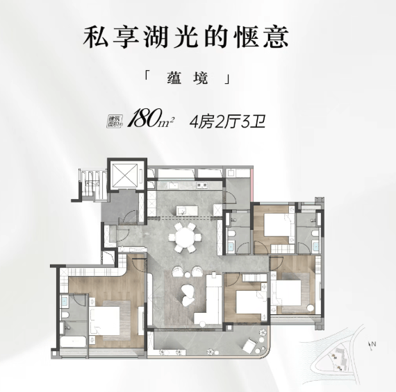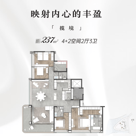 目前在售主力户型为建面约237平方米的大平层,四房以上格局,南北通透,主卧套房配备独立衣帽间与卫浴,客厅面宽超7米,搭配全景落地窗,将社区园林与远处城市天际线尽收眼底。无论是三代同堂的大家庭,还是追求生活格调的精英人士,都能在此找到理想的生活容器。