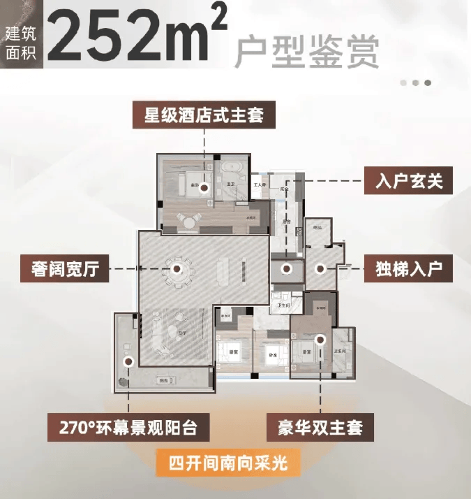 252㎡四房四卫:专梯专户设计,彰显高端品质与私密性。18.9米南向面宽搭配15米转角阳台,采光通风极佳,转角阳台能提供更广阔的观景视野,在家就能享受360°的湖山美景。中西双厨+全套房布局,适配大家庭居住,中西双厨能满足不同的烹饪需求,全套房设计则让每个家庭成员都能拥有独立的私密空间,生活更加惬意。