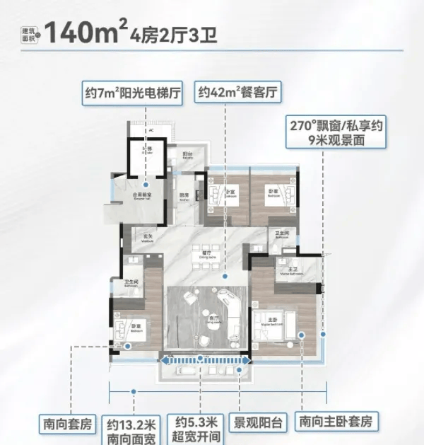 140㎡四房三卫:总价约980万起,南向13.2米面宽搭配双套房设计,空间宽敞舒适,私密性强。270°环幕飘窗是该户型的一大亮点,坐在飘窗上就能欣赏到优美的湖景,让室内空间与自然景观完美融合。双套房设计能满足多代同堂家庭的需求,长辈与年轻人拥有独立的卫浴空间,生活更加便捷舒适。
